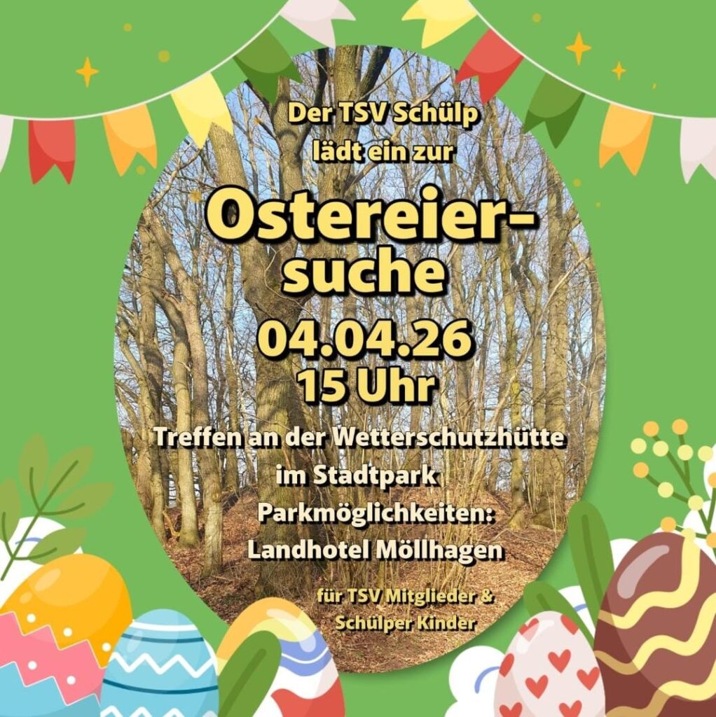 Der TSV Schülp lädt am 4. April 2026 zur Ostereiersuche ein. Freut euch auf einen schönen Familiennachmittag mit Überraschungen, Kuchen und gemütlichem Beisammensein.